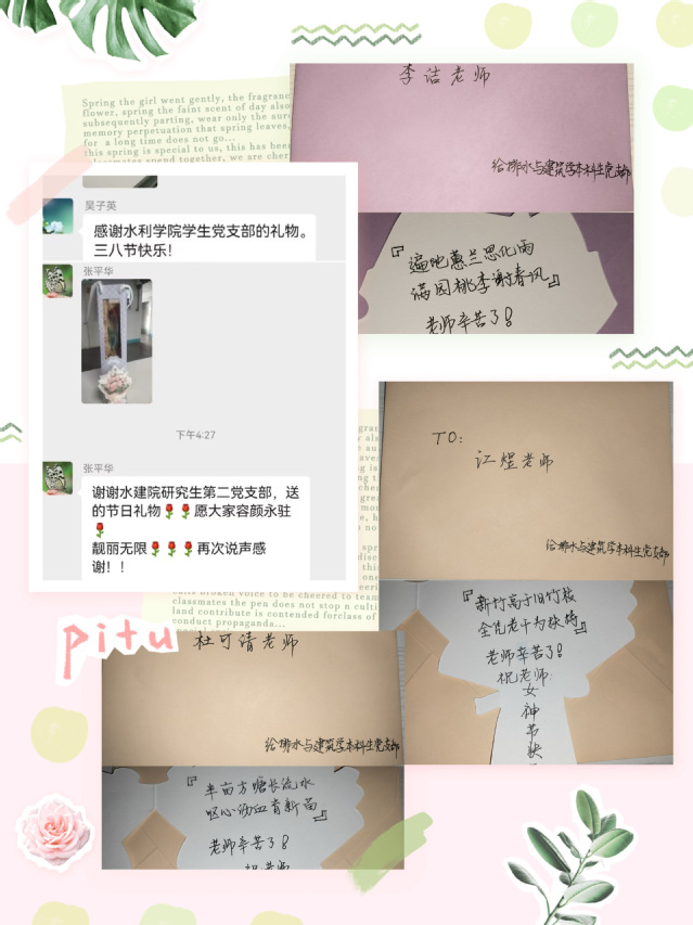 三月,春暖校园,在明媚的春光里,也迎来了“三八”国际妇女节114周年。在这特殊的日子里,水建学院团委、学生党总支联合策划开展了“情暖三月,礼赞巾帼”感恩教育系列活动,号召学院全体学生党员、团员青年带头,全体学生共同参与,向基层一线女教师和宿管阿姨等后勤服务保障女员工献上鲜花,送出祝福,以此表达水建学子对她们在“三全育人”体系建设中的辛勤付出和默默奉献的感恩之情。